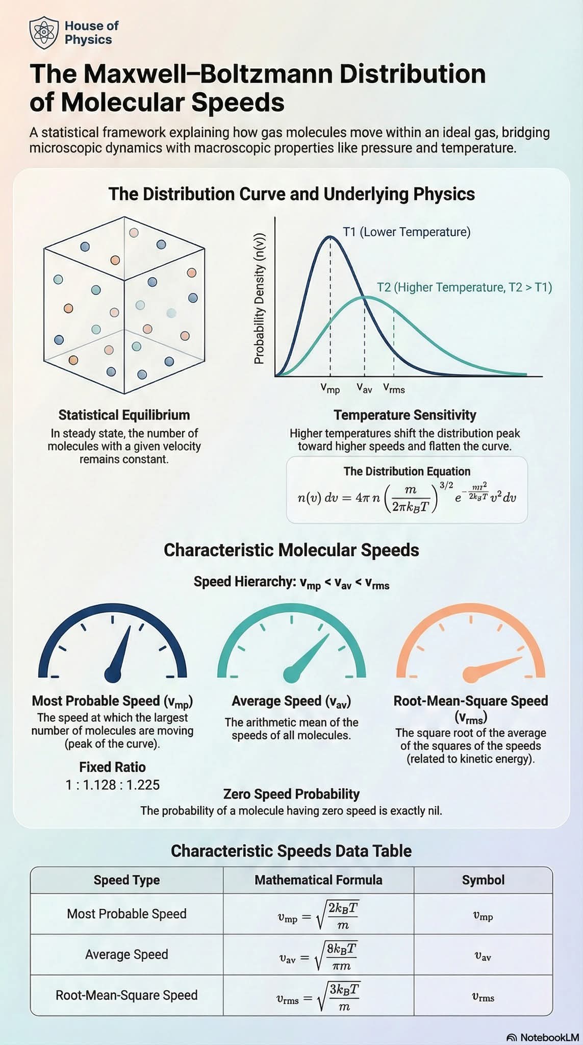 \[f(v) dv = 4\pi \left(\frac{m}{2 \pi k_B T}\right)^{3/2} v^2 \exp\Big(-\frac{m v^2}{2 k_B T}\Big) dv\]